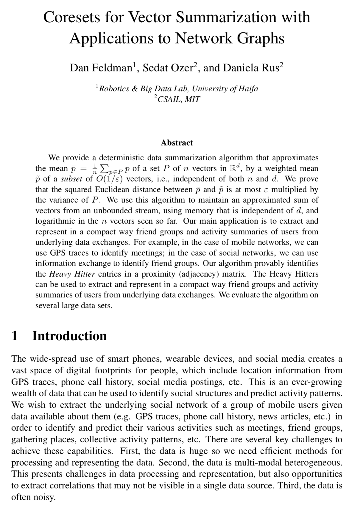 In this project, we developed new techniques to process large location-based datasets for the detection of various types of activities. In particular, we developed and applied coreset-based techniques to summarize and speed up the computation while maintaining an approximate accuracy of dynamic social networks from streaming GPS-based location datasets with bounded errors.Our ICML 2017 paper won NVIDIA's Pioneering Research award.
