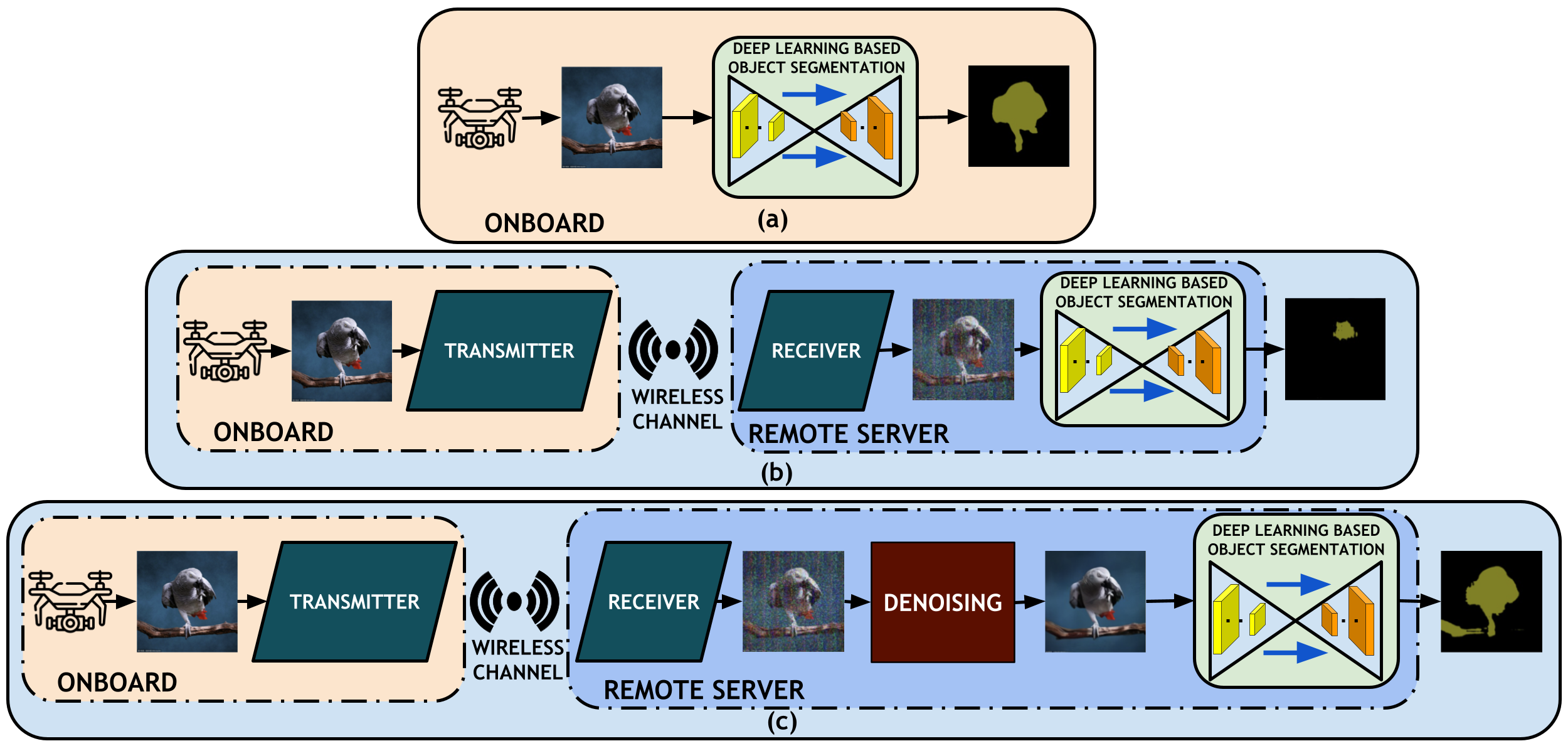 In many systems, computer vision applications such as object detection and segmentation are typical tasks to offload. And in many of those cases, such vision algorithms are handled by using pretrained off-the-shelf (such as YOLO) algorithms. Offloading such segmentation or object detection tasks over wireless channels might cause some issues resulting in reduced detection or segmentation performance. We first study and demonstrate such issues for a 5G wireless system and then, introduce solutions in our 2023 paper published at IEEE Transactions on Vehicular Technology: Offloading Deep Learning Powered Vision Tasks from UAV to 5G Edge Server with Denoising.